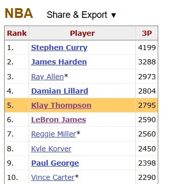 NBA历史三分榜Top10(今日赛前):