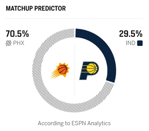 赛前,美媒ESPN预测本场比赛,太阳胜率70.5%,步行者胜率29.5%。